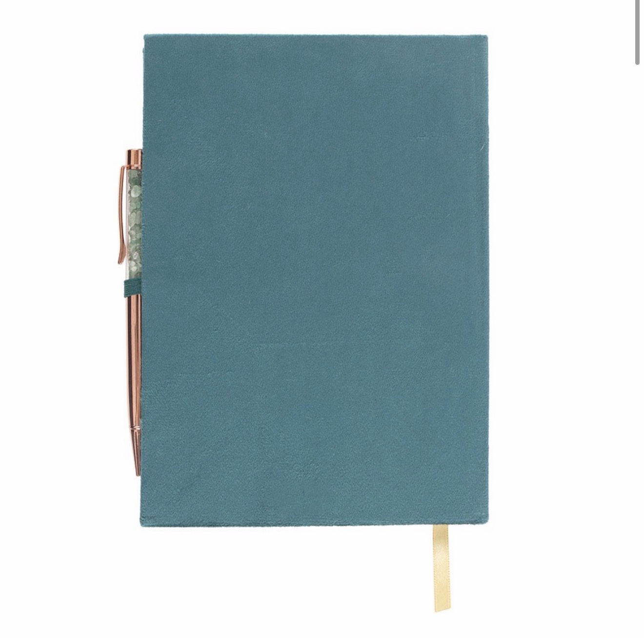 Jot down affirmations, manifest goals and record gratitude in this Book of Abundance journal with lined pages. This green journal features mystical, metallic gold detailing on the cover and a gold ribbon page marker, paired with a sleek green aventurine crystal pen for promoting prosperity, wealth and good fortune. 100 sheets / 200 lined pages.
