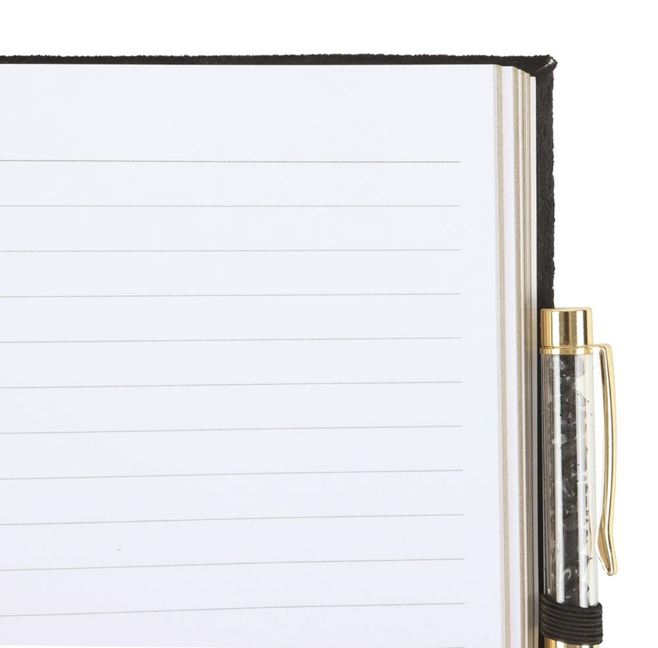 This black journal features mystical, metallic gold detailing on the cover and a gold ribbon page marker, paired with a sleek black obsidian crystal pen known for its protecting and grounding properties.