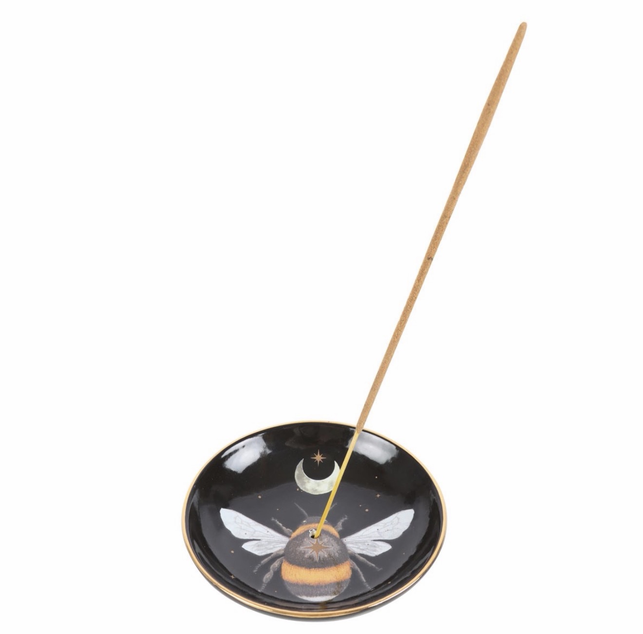 Practical and stylish, this gorgeous incense plate is adorned with a delicate forest bee design with pretty celestial details including a silvery moon and golden stars. The plate is thoughtfully designed to accommodate both incense sticks and cones, featuring a small hole in the center for sticks and a flat, stable surface suitable for burning cones.