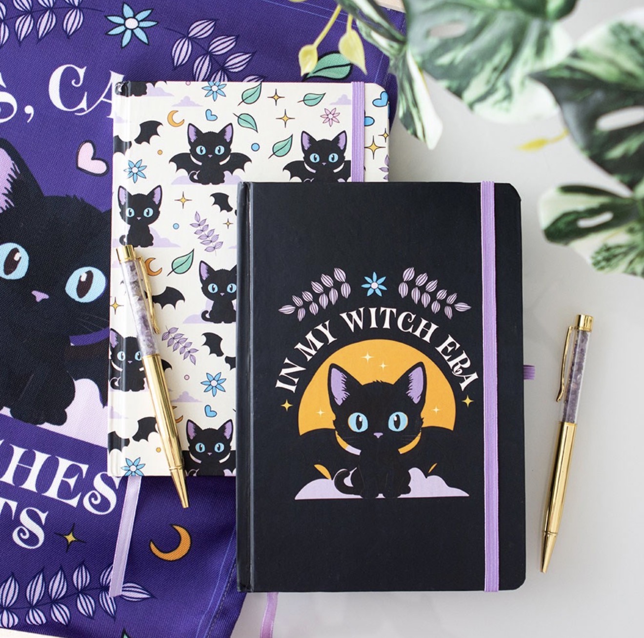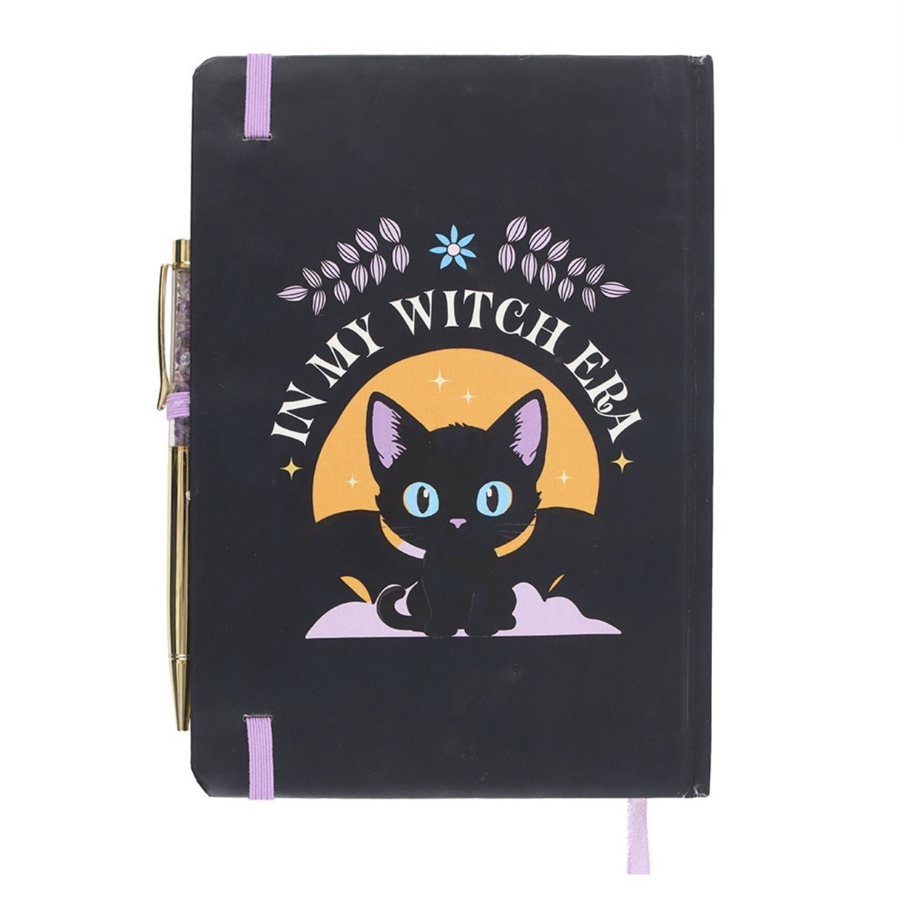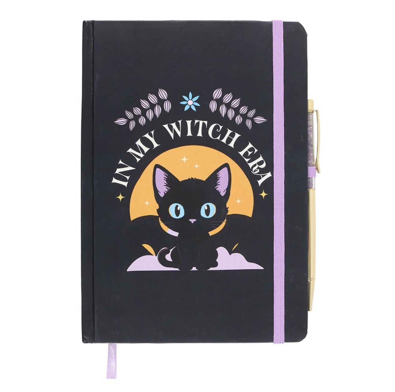 Jot down spells, thoughts, or to-do lists with this A5 notebook featuring the phrase ‘In My Witch Era’ and a bat-winged black cat design.