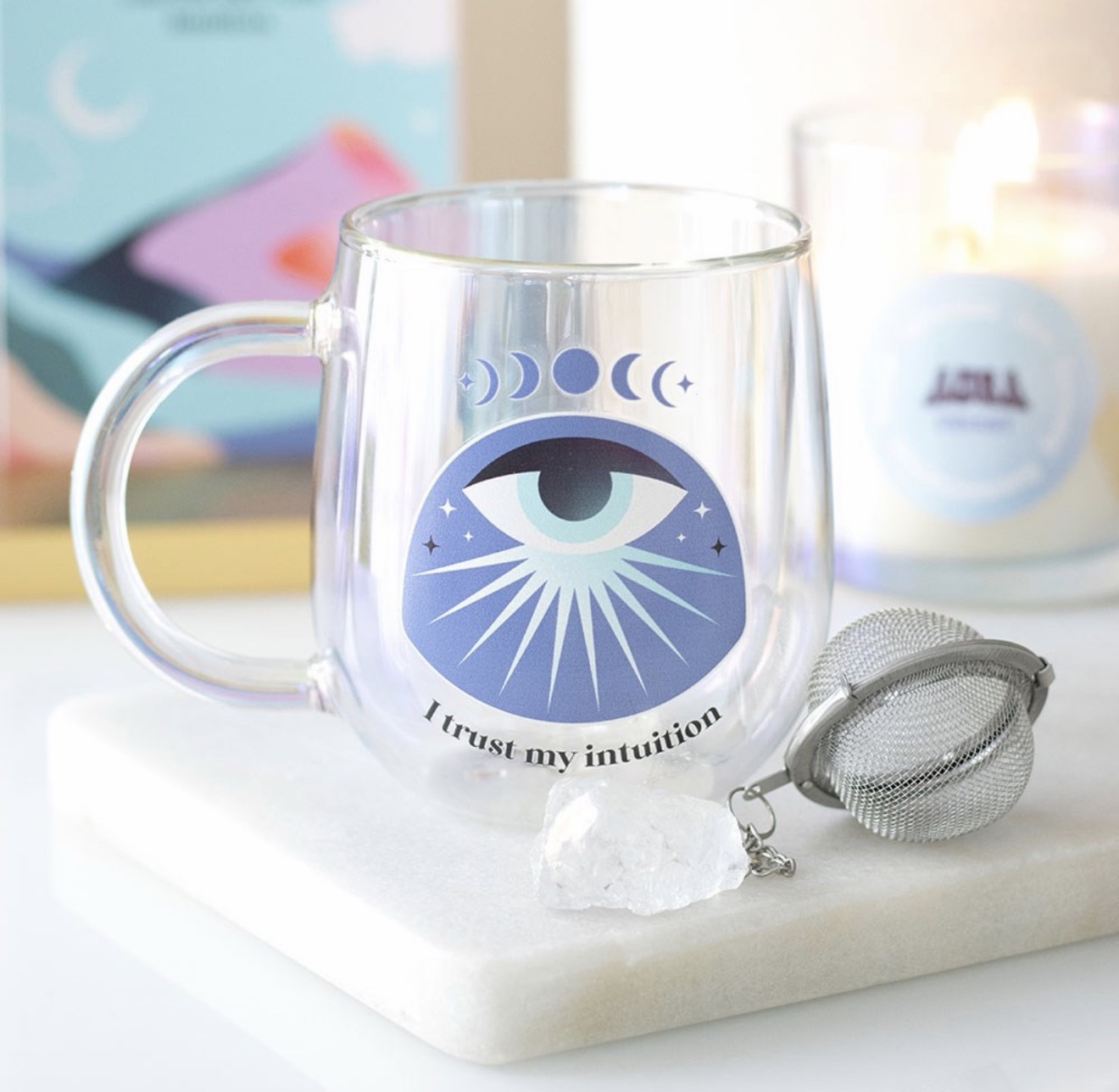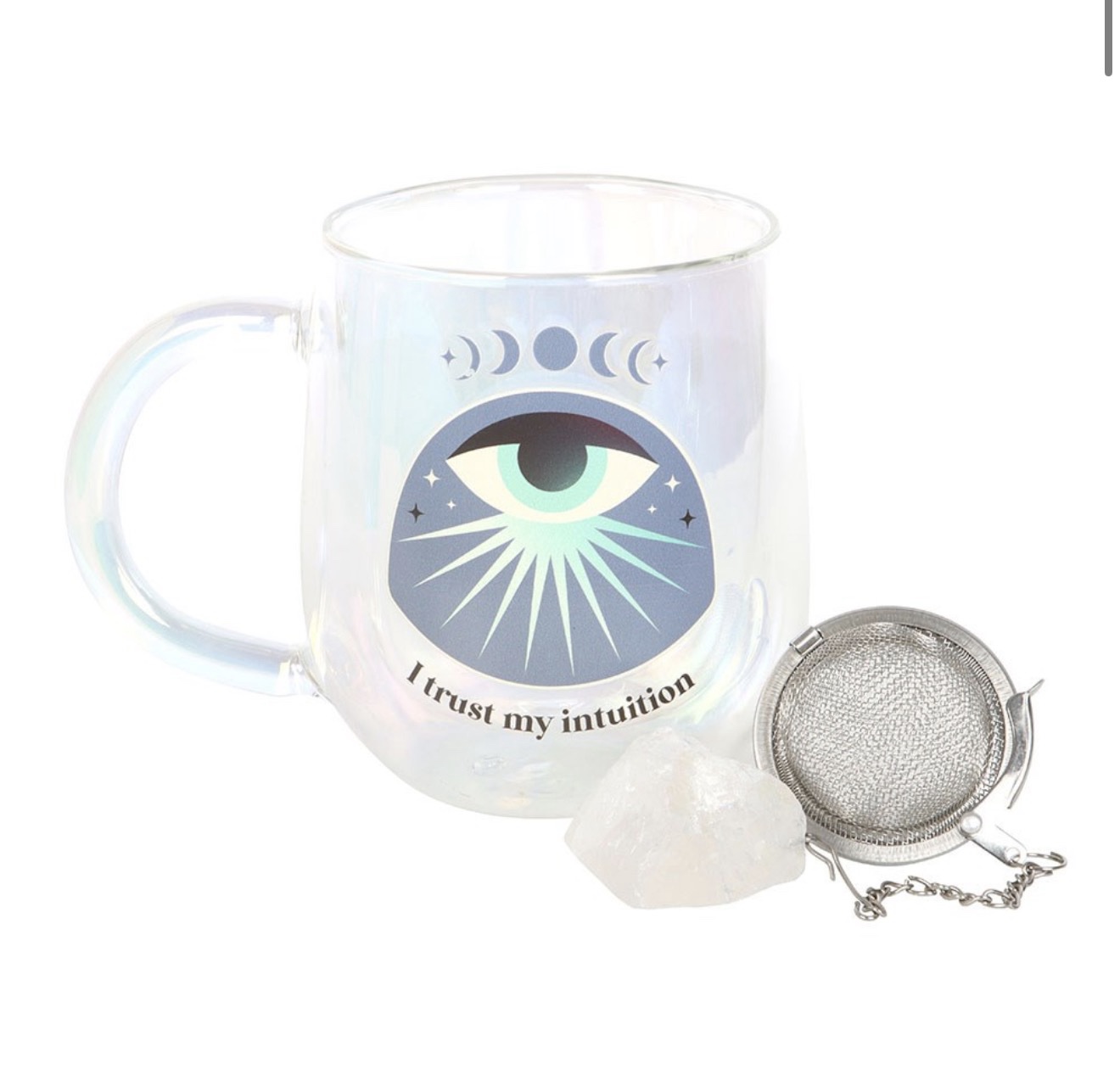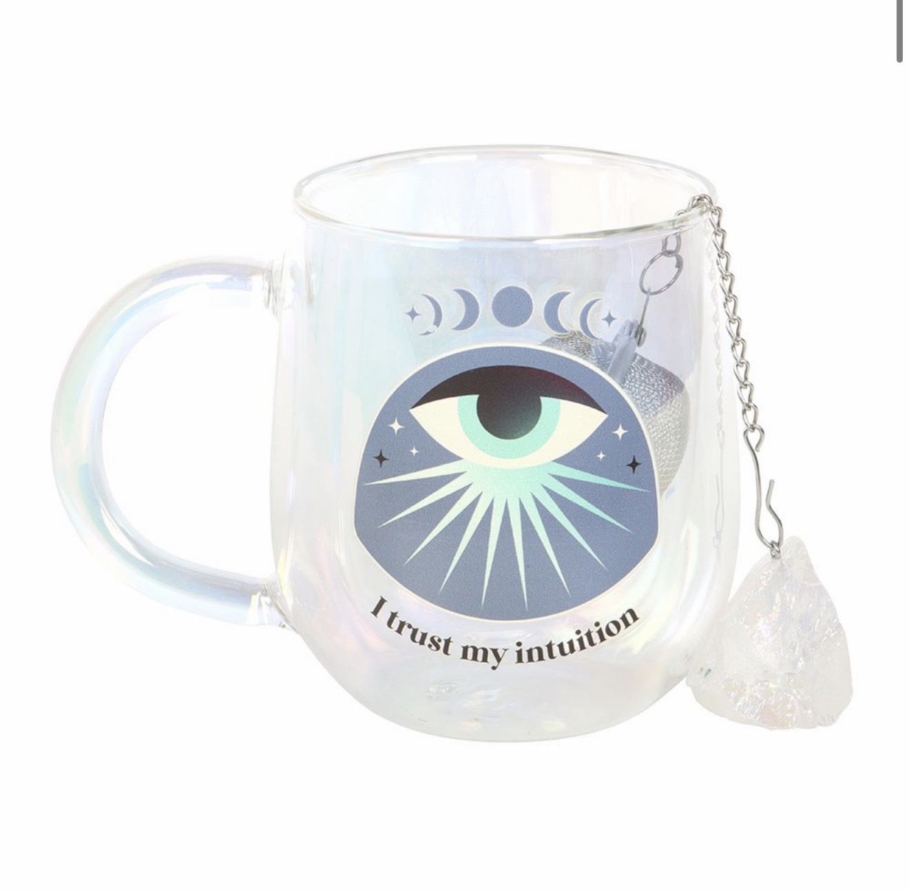 Sip your favourite brew in style with this double-walled glass mug featuring a mystical all-seeing eye design and ‘I trust my intuition’ affirmation. Includes a matching aura crystal tea infuser for those who love a mindful tea ritual. 250ml capacity. Do not microwave. Hand wash only. Warm mug before use.