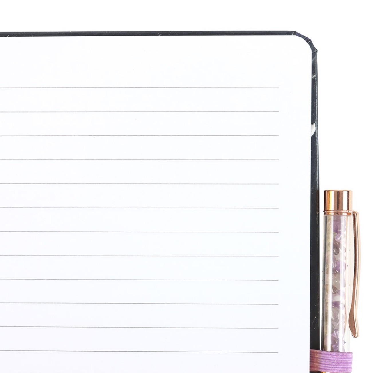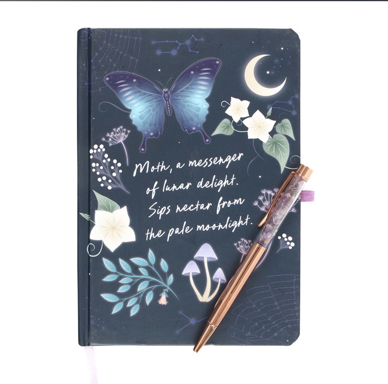 This journal makes the perfect place to keep track of hopes, dreams and intentions. Featuring a midnight moth design surrounded by a beautiful night’s sky and forest plants, this journal comes with an elegant amethyst crystal chip ballpoint pen.