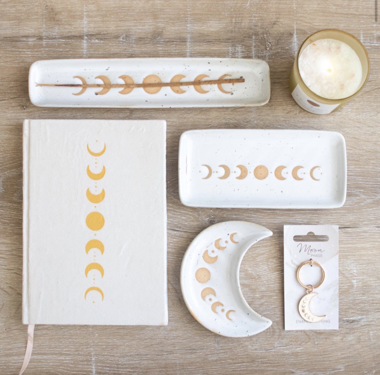 Features a moon phase design in a wax resist finish that gives this piece a stunning, handmade feel.