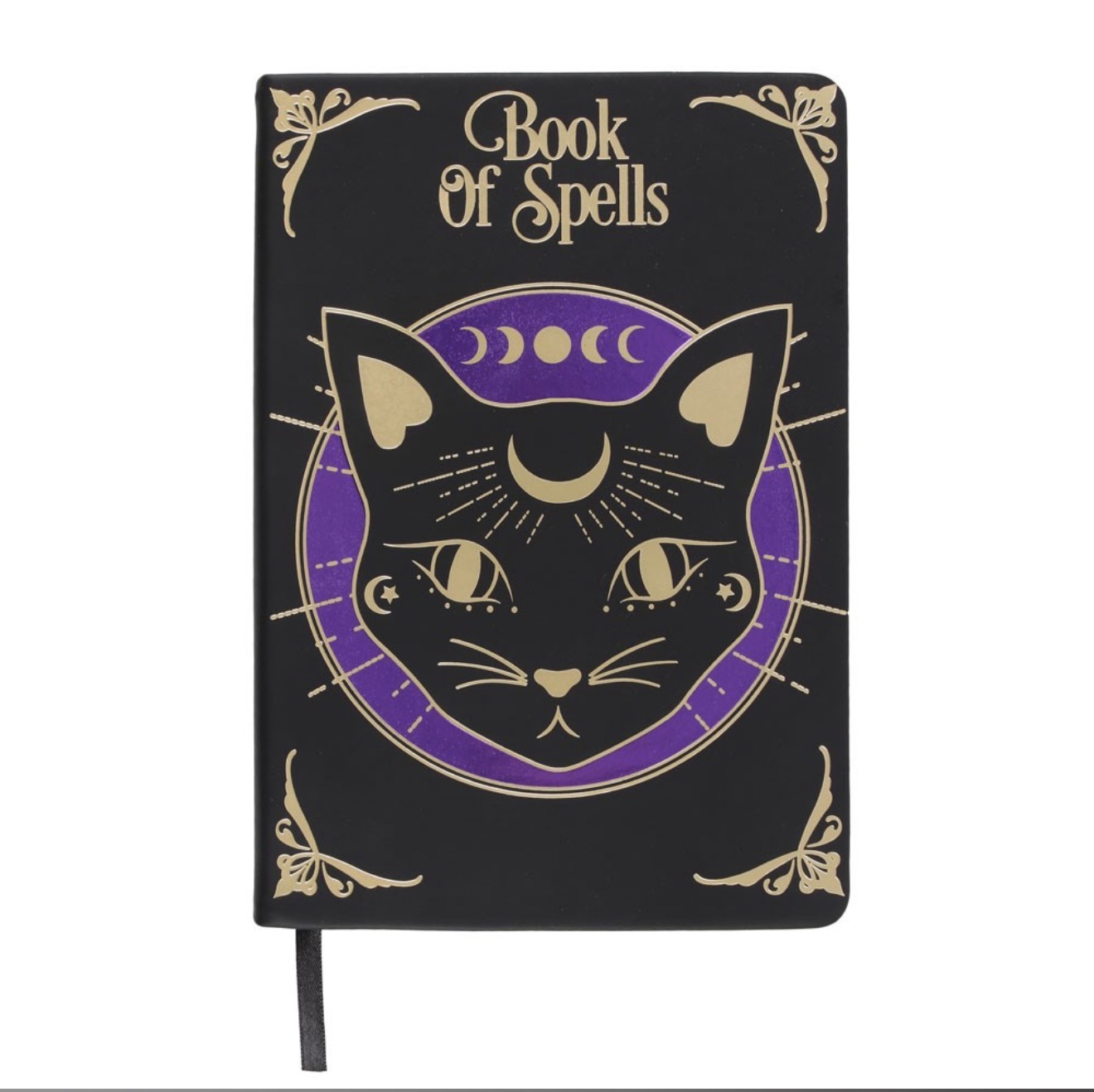 A mysterious black cat is accented by gold foil details and a purple moon. Lined pages.