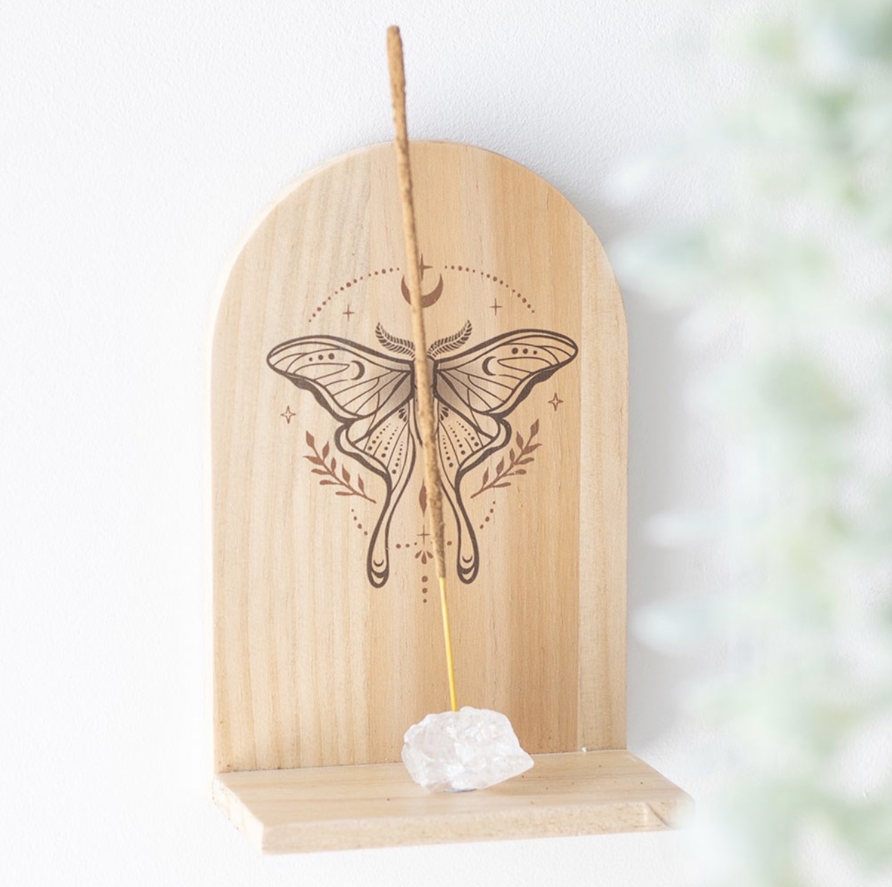 Add a touch of ethereal ambiance to the home with this natural wooden incense shelf featuring an elegant luna moth design, perfect for dispersing fragrance more freely.