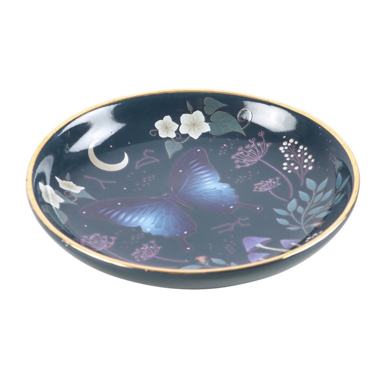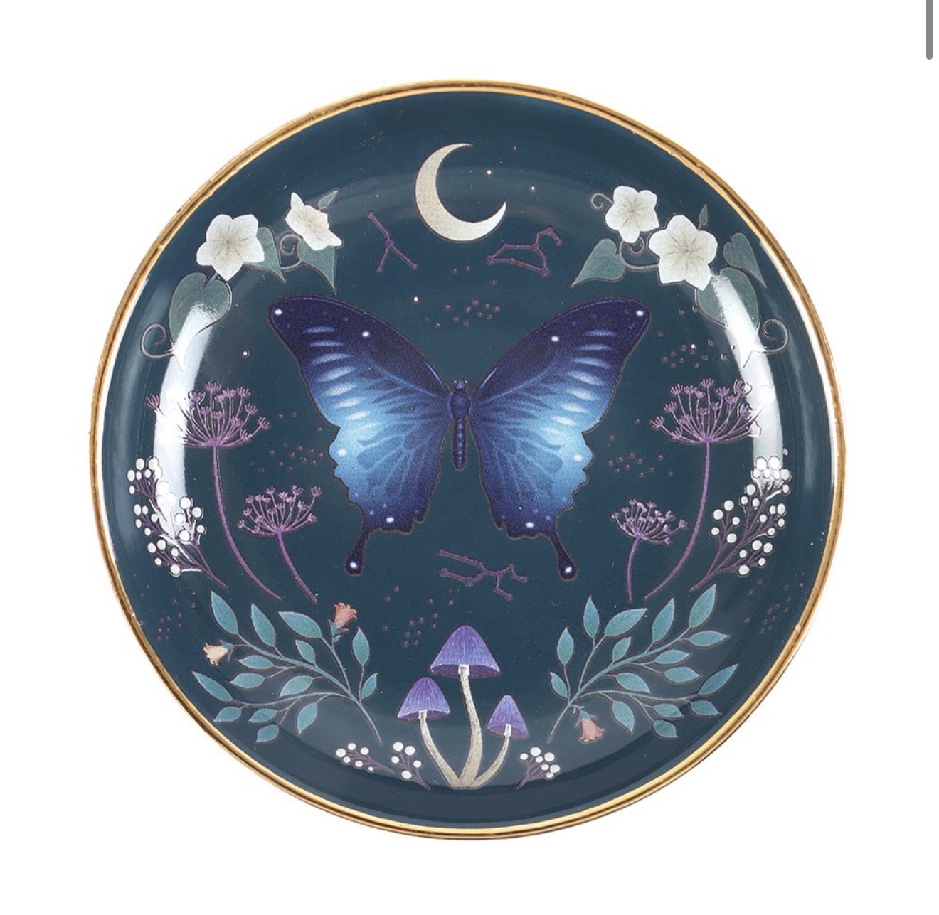 This enchanting trinket dish features a stunning midnight moth design in hues of blue inspired by the night sky.