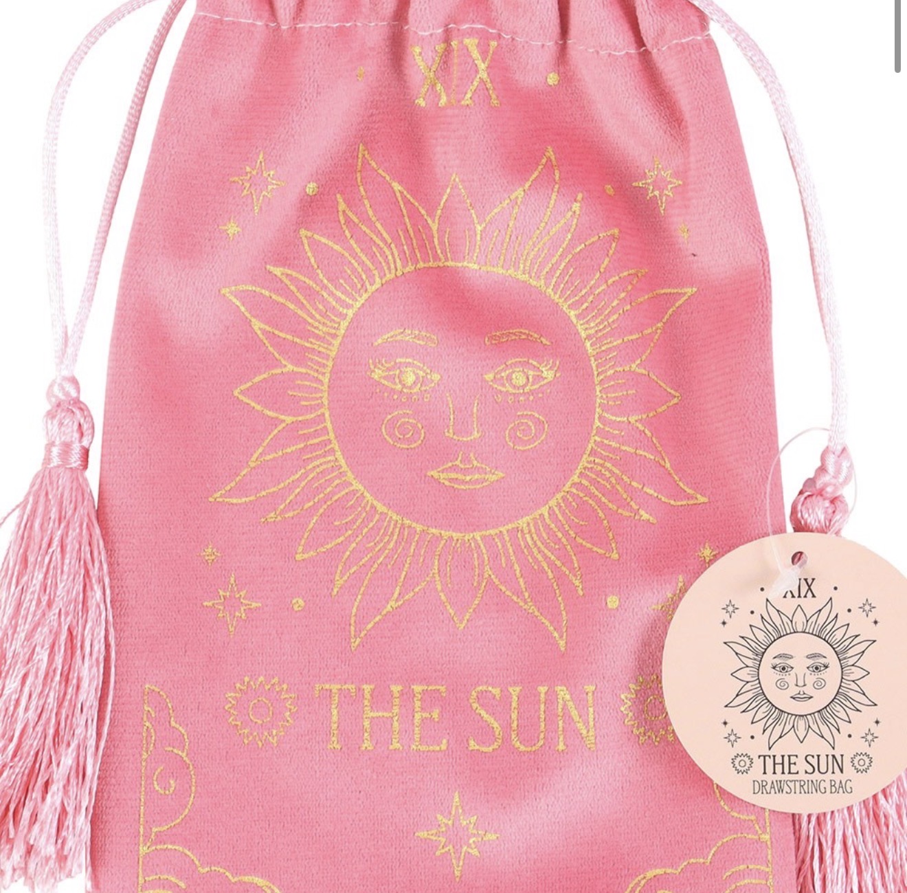 A soft pink velvet drawstring bag featuring a gold printed The Sun tarot card design.