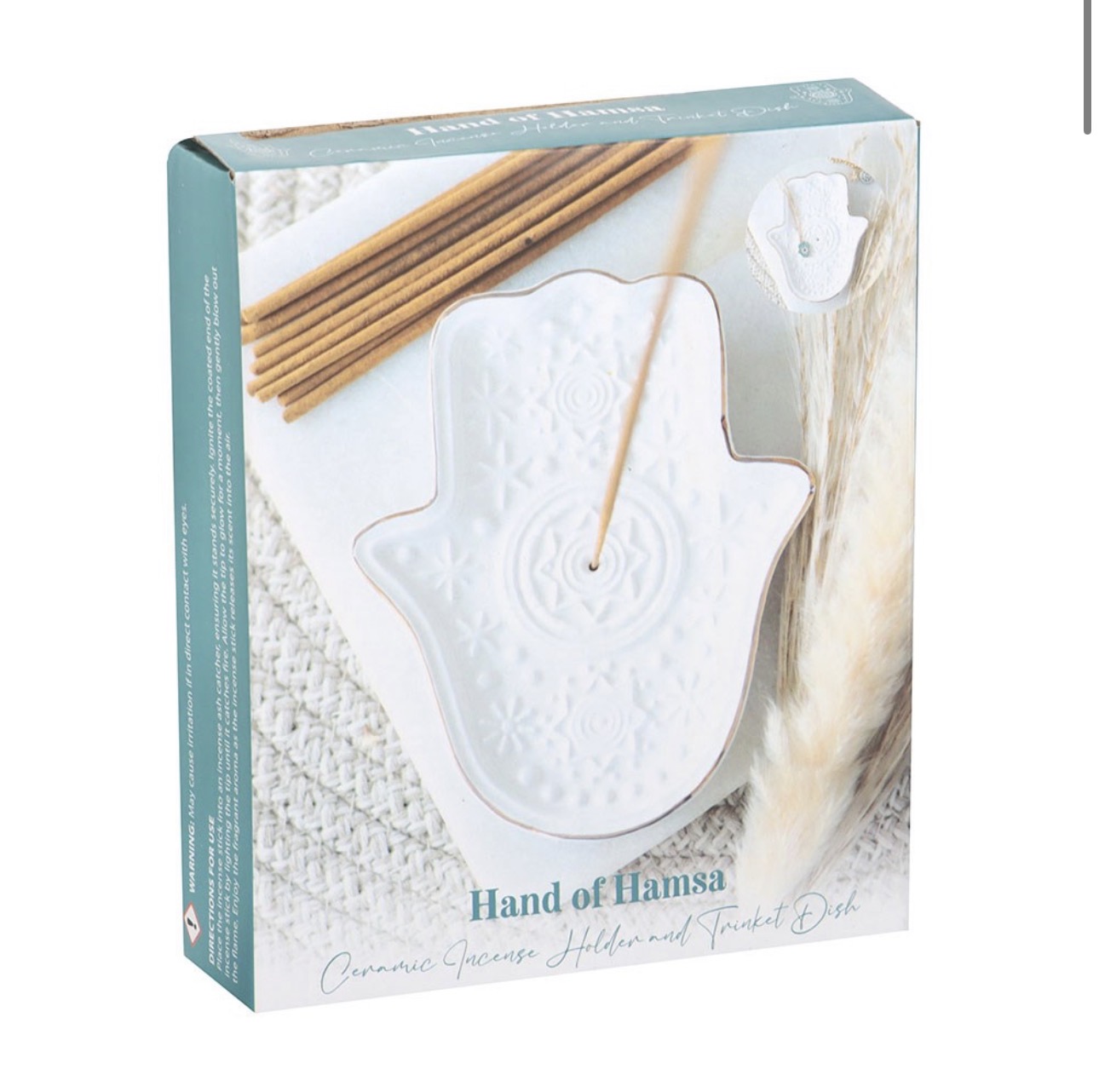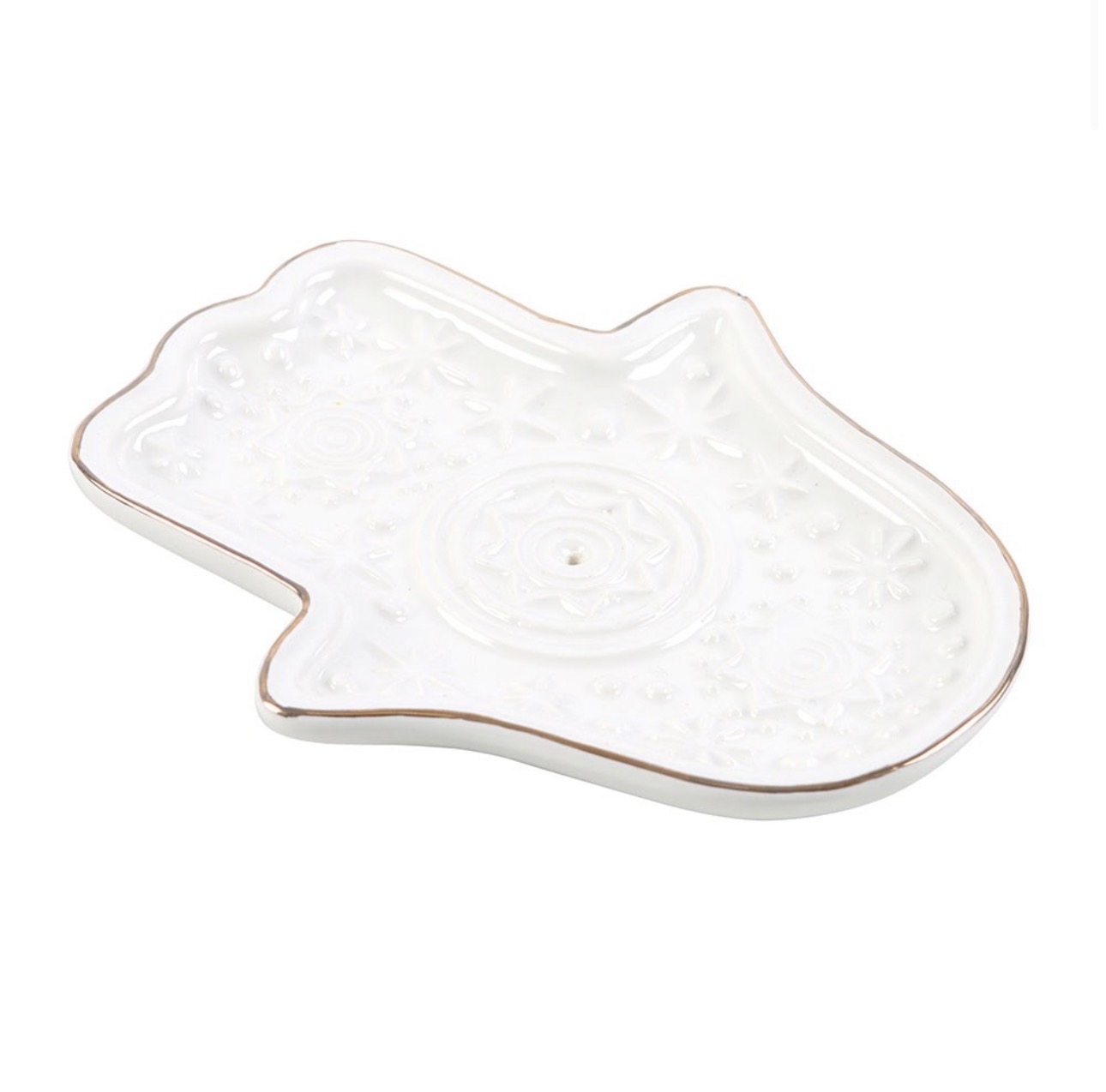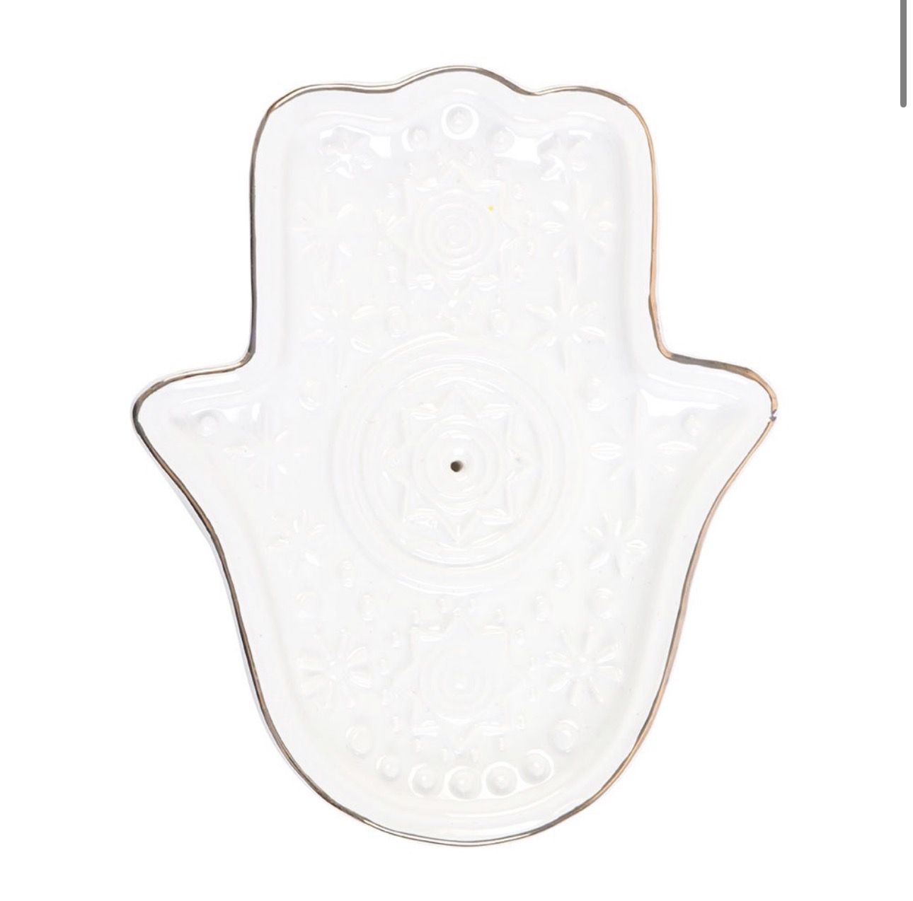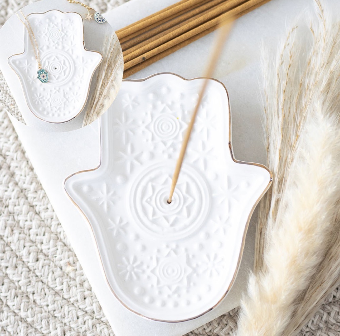Infuse your space with protective energy using this white ceramic incense holder shaped like the Hand of Hamsa.