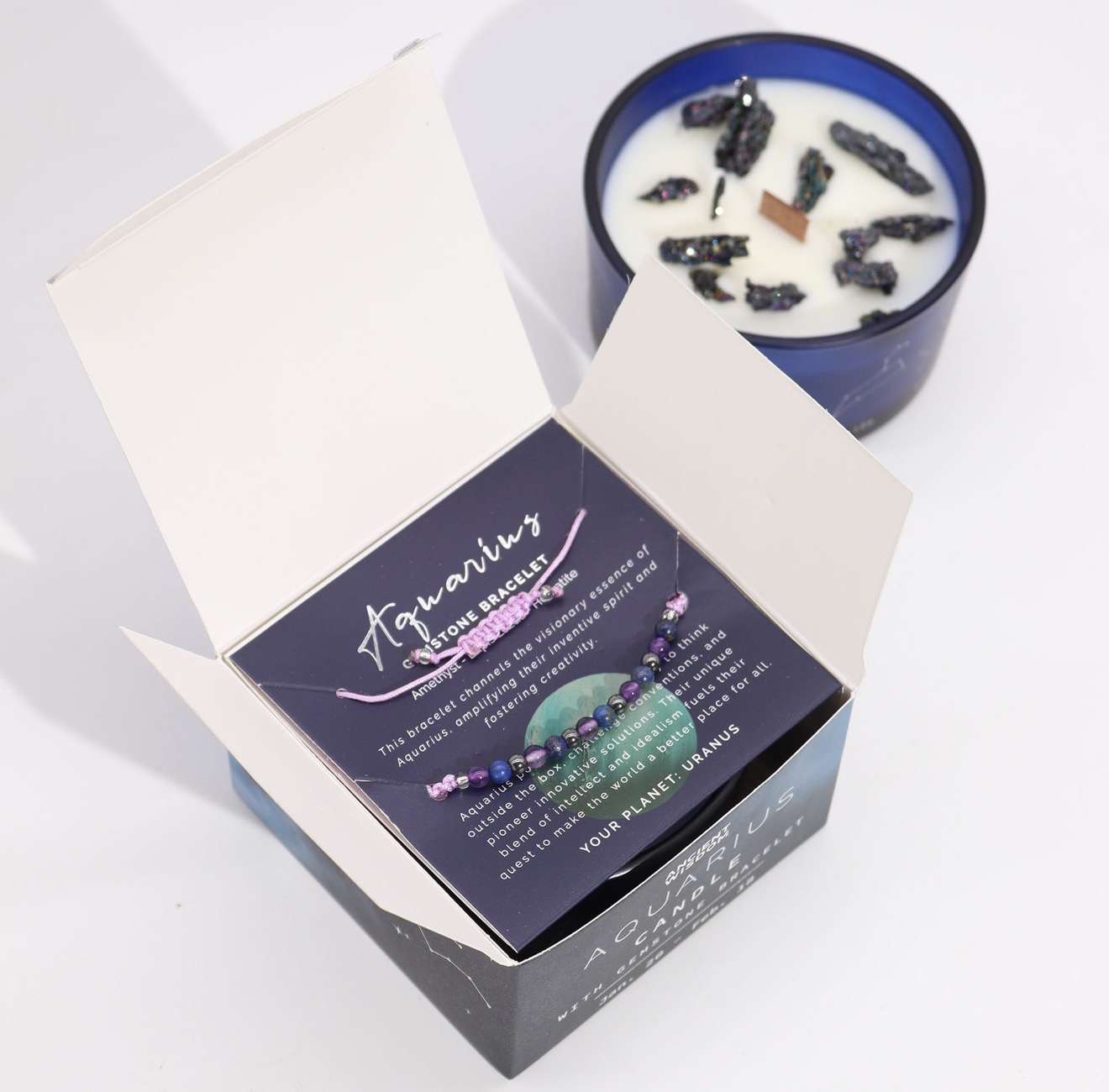 The set includes a gemstone bracelet made of amethyst, lapis lazuli, and hematite. Each stone is carefully selected to align with the strengths of Aquarius: